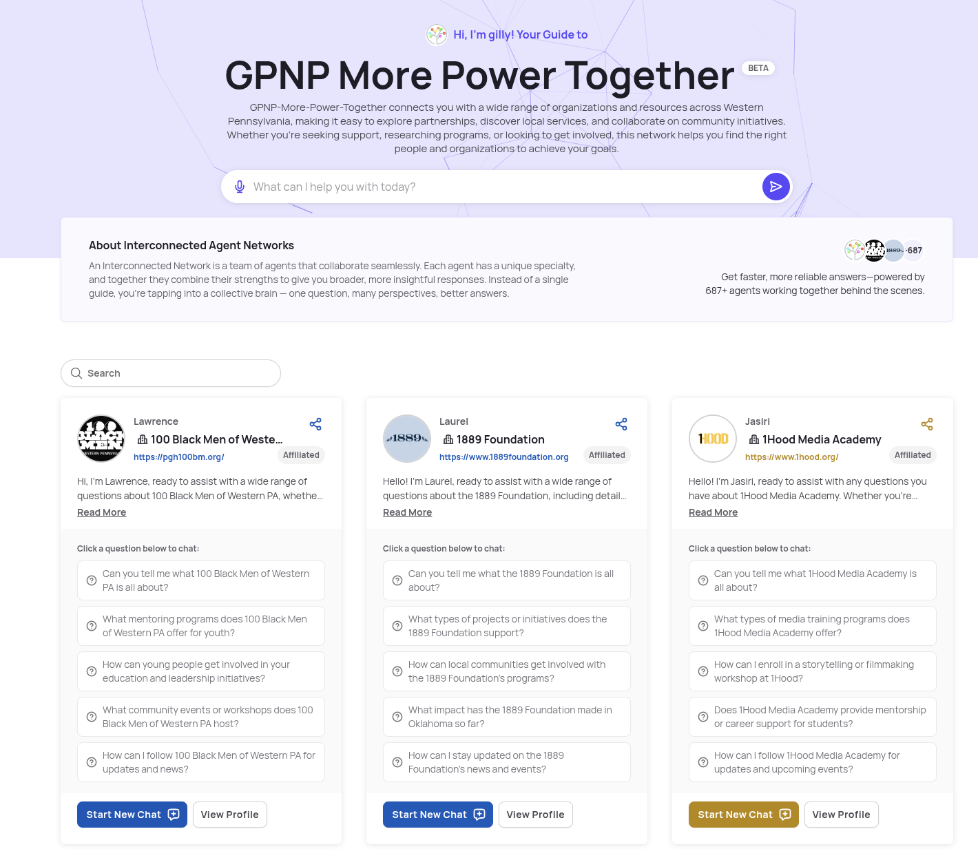 One example of AI at work: a connected directory where every nonprofit has an AI Guide that can answer questions, make referrals, and help people take action.